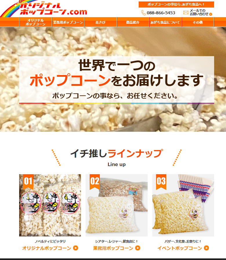 最後になりましたがポップコーンのことなら、あぜち食品の「オリジナルポップコーン.com」、イベントポップコーンのことなら楽天市場「イベントポップコーンと販促おつまみ」ショップ、ウェディングプチギフトなら「ぷち福」サイトまでお越しください。